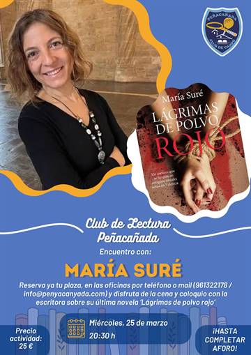 Este En marzo celebramos un nuevo encuentro del Club de Lectura de Peñacañada. En esta ocasión nos acompañará María Suré en la cena-coloquio. Durante la velada comentaremos su novela 'Lágrimas de polvo rojo', compartiremos impresiones y resolveremos las dudas al respecto.