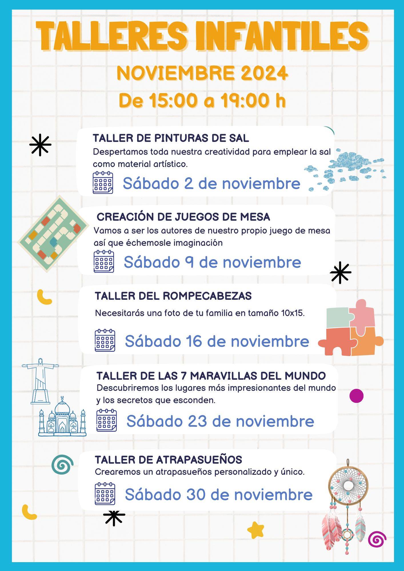- Sábado 16 de noviembre. 🧩Taller de rompecabezas. Necesitarás una foto de tu familia en tamaño 10x15.