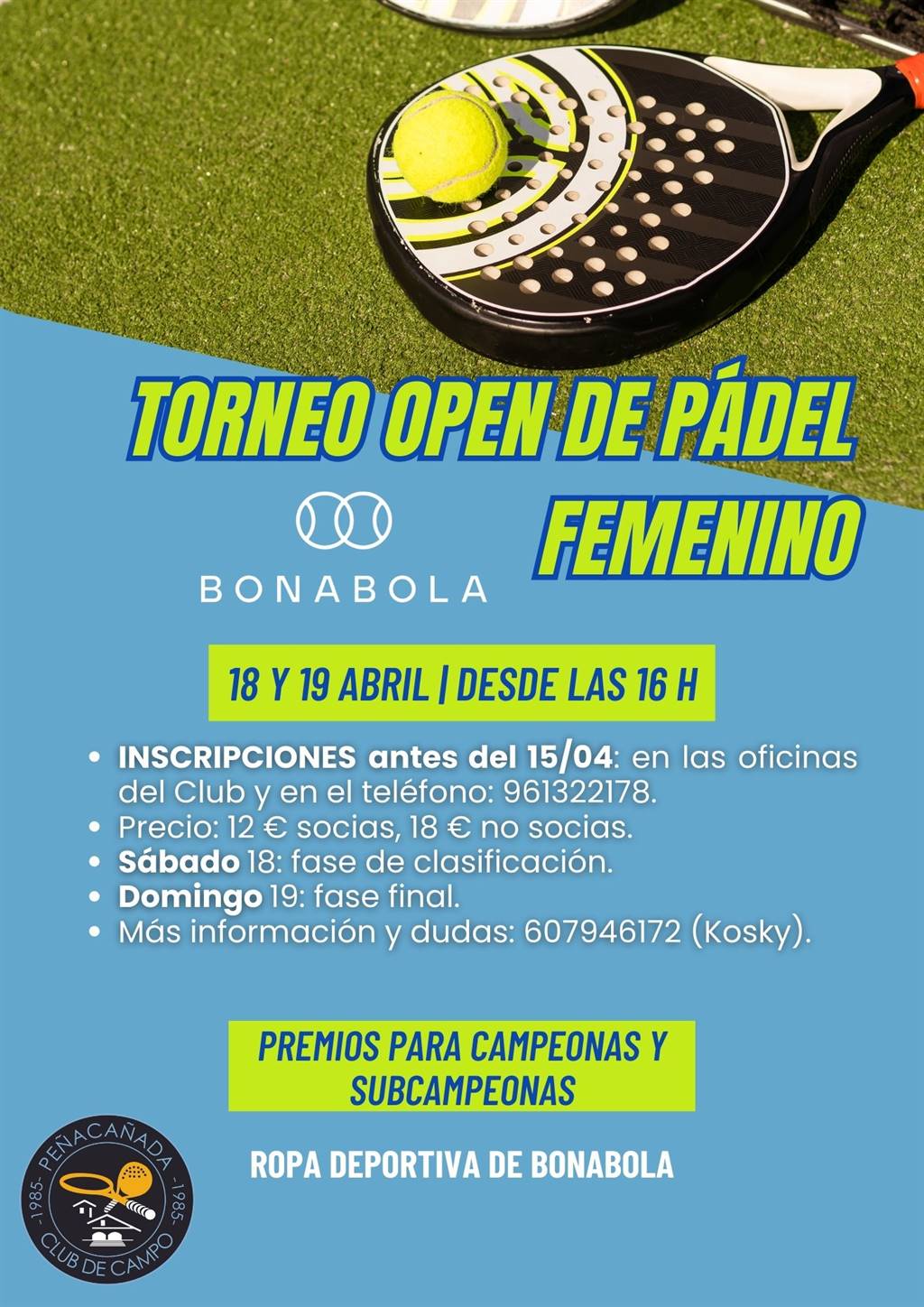 Habrá premios para campeonas y subcampeonas: ropa deportiva Bonabola.