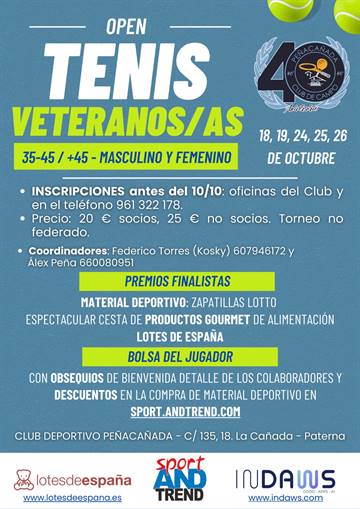 Peñacañada organiza el Open de Veteranos/as de Tenis los días 18, 19, 24, 25 y 26 de octubre. Se trata de un torneo no federado, abierto a jugadores de otros clubes.