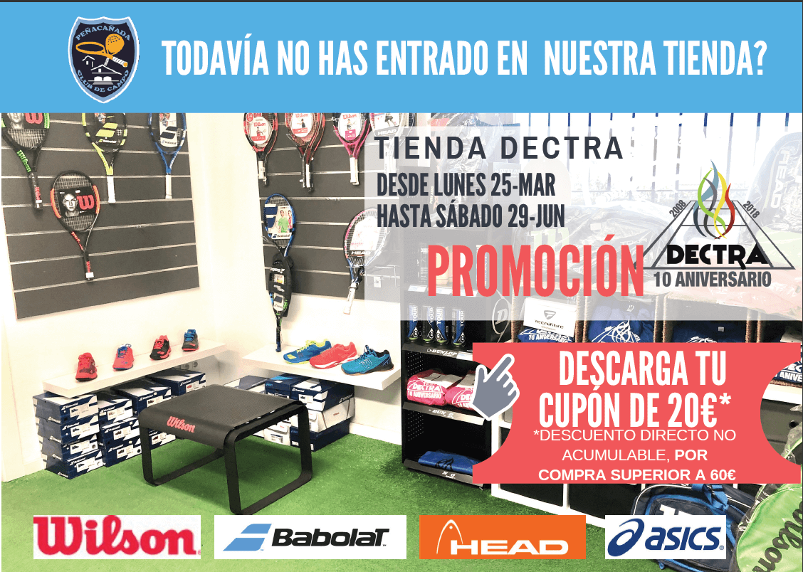 Con motivo del X Aniversario de la Escuela de tenis y pádel de Peñacañada, desde hoy, lunes 25 de marzo hasta el 29 de junio podréis beneficiaros de un cupón de 20 € en la tienda*. Para ello, se deberá presentar un cupón descargable que se puede conseguir haciendo clic AQUÍ.