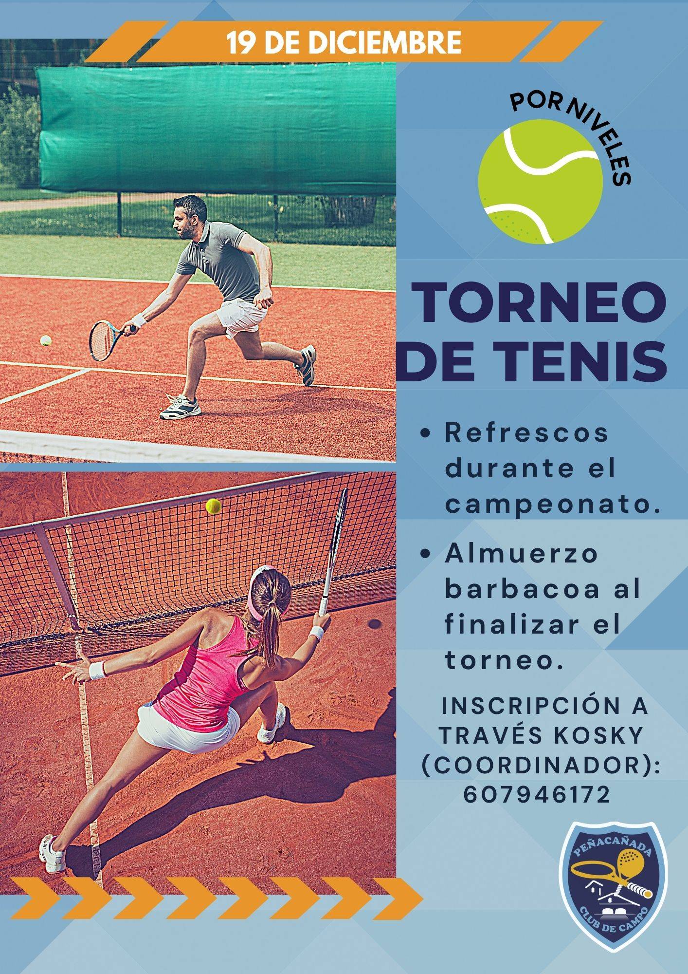 El próximo domingo 19 de diciembre celebraremos en Peñacañada el Torneo de Tenis por niveles. Durante el mismo, los participantes disfrutarán de refrescos durante toda la competición y cerraremos la jornada con un almuerzo de barbacoa.